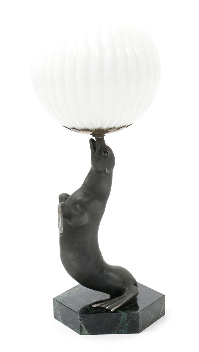 An Art Deco spelter model of a seal, modelled on hind flippers balancing a spherical glass shade on its snout, on green veined marble base, etched signature to marble, 35cm. high