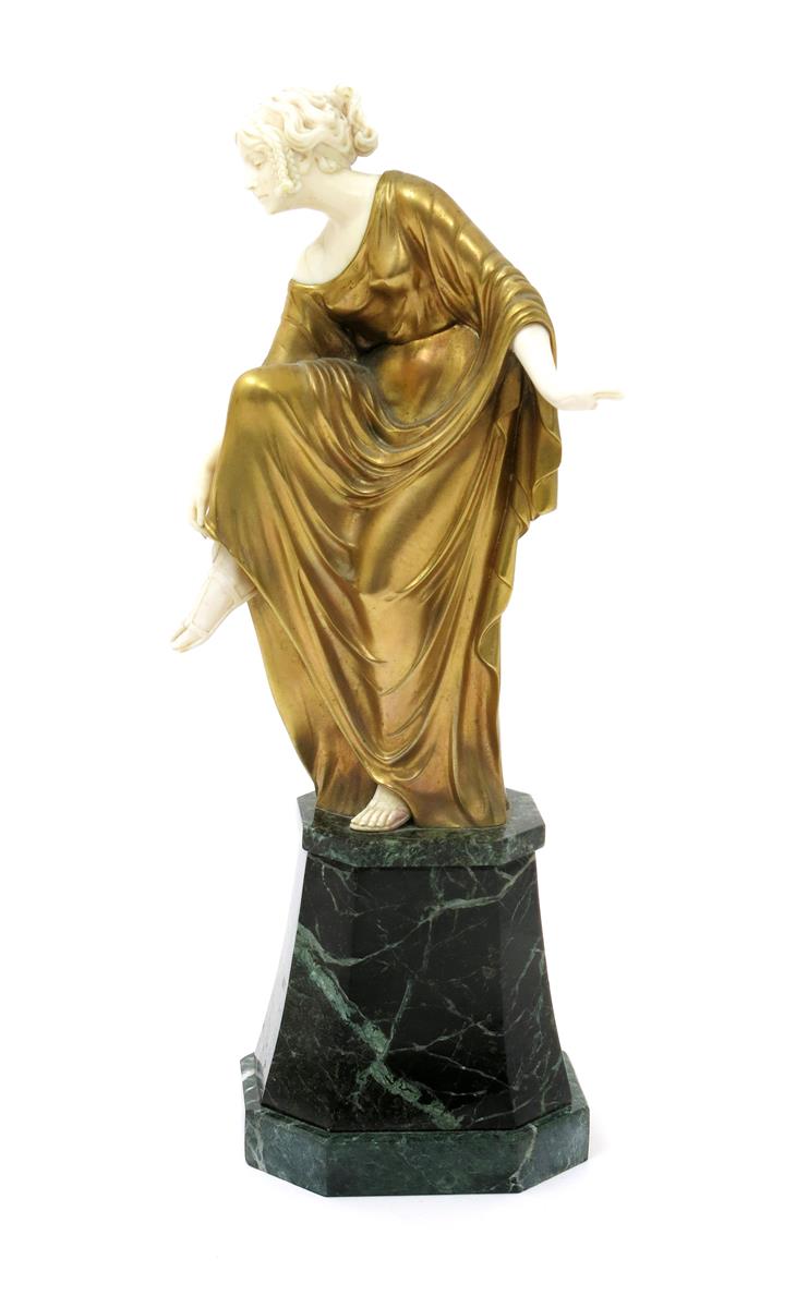 λ A gilt bronze and ivory model of a Classical maiden cast and carved from a model by Leonie Boehm-Henes, modelled standing on one leg, reaching down to her raised foot on flaring, green veined marble base, signed in the cast Boehm-Henes, one finger missing, 35cm. high