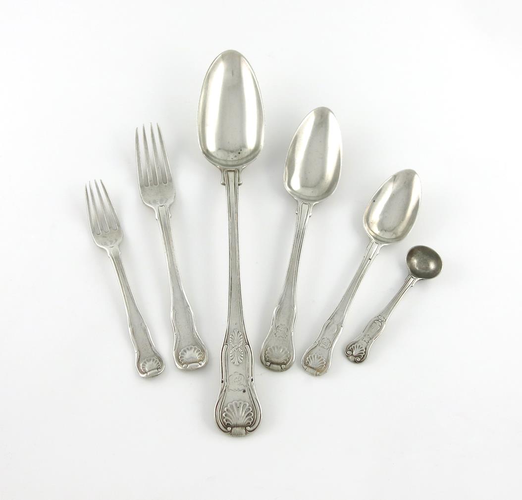 comprising: two basting spoons, nine tablespoons, thirteen dessert spoons, eighteen table forks, six dessert forks and two condiment spoons, crested, approx. weight 125oz. (50)