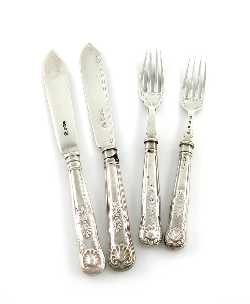 comprising: twenty-two fish knives by Goldsmiths & Silversmiths Co. (William Gibson & John Lawrence Langman), Sheffield 1894, eleven fish knives by Goldsmiths & Silversmiths Company Ltd., London 1905 and three other fish knives, seventeen fish forks by Carrington & Co, London 1914, and two other fish forks, engraved with a regimental badge, hollow handles, approx. weight 95oz. (55)