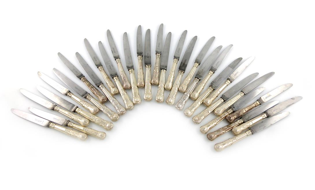A set of eleven silver-handled King's pattern table knives and nineteen dessert knives