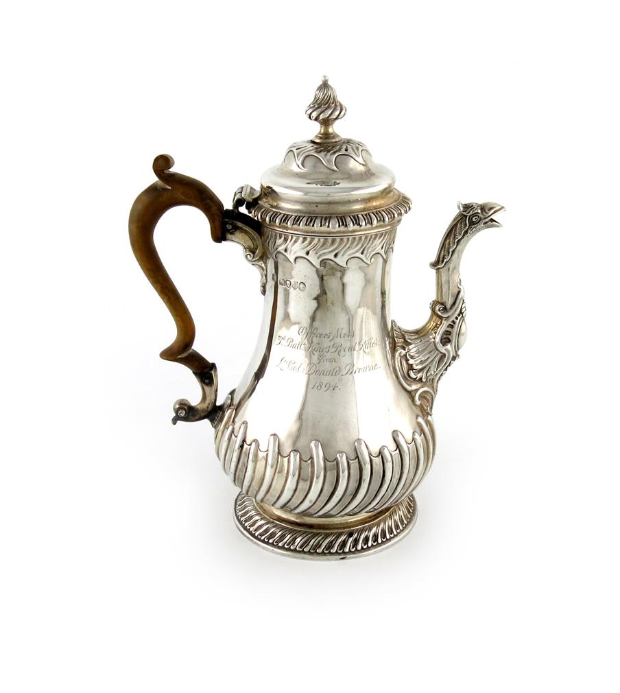 baluster form, part-fluted decoration, scroll handle, bird mask capped spout, domed hinged cover with a fluted finial, inscribed 'Officer's Mess 3rd battalion King's Royal Rifles from Lt. Col. Donald Browne, 1894', on a circular foot, height 26.5cm, approx. weight 30oz.