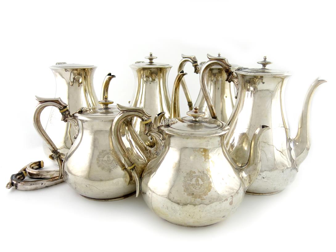 λA collection of four large electroplated regimental coffee pots and two teapots