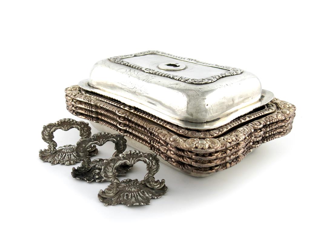 rectangular form, engraved with the regimental badge, gadroon and foliate borders, detachable handles, very heavily repaired, length 32cm, approx. weight 270oz. (10)