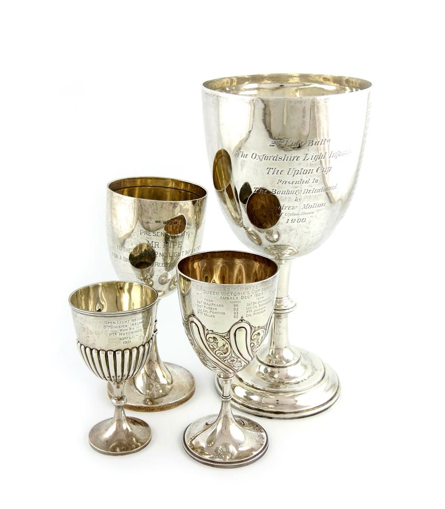 comprising a large one: 'The Upton Cup', Sheffield 1898, a replica of 'The Rampur Football Challenge Cup', Birmingham 1922, plus 'The Queen Victoria's Cup Abroad', Sheffield 1902, and the 'Open Light Weight 6th Division Ireland', Chester 1910, height of tallest 32.7cm, approx. weight 47.9oz. (4)