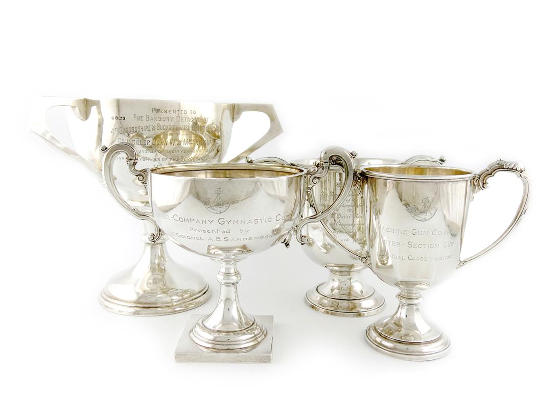 comprising: 'The Banbury Cup', Sheffield 1911, 'The Inter Company Gymnastic Cup', by the Goldsmiths and Silversmiths Company, London 1929, 'The Machine Gun Company Inter-Section Cup', London 1929, and the approx. weight 72oz. (3)