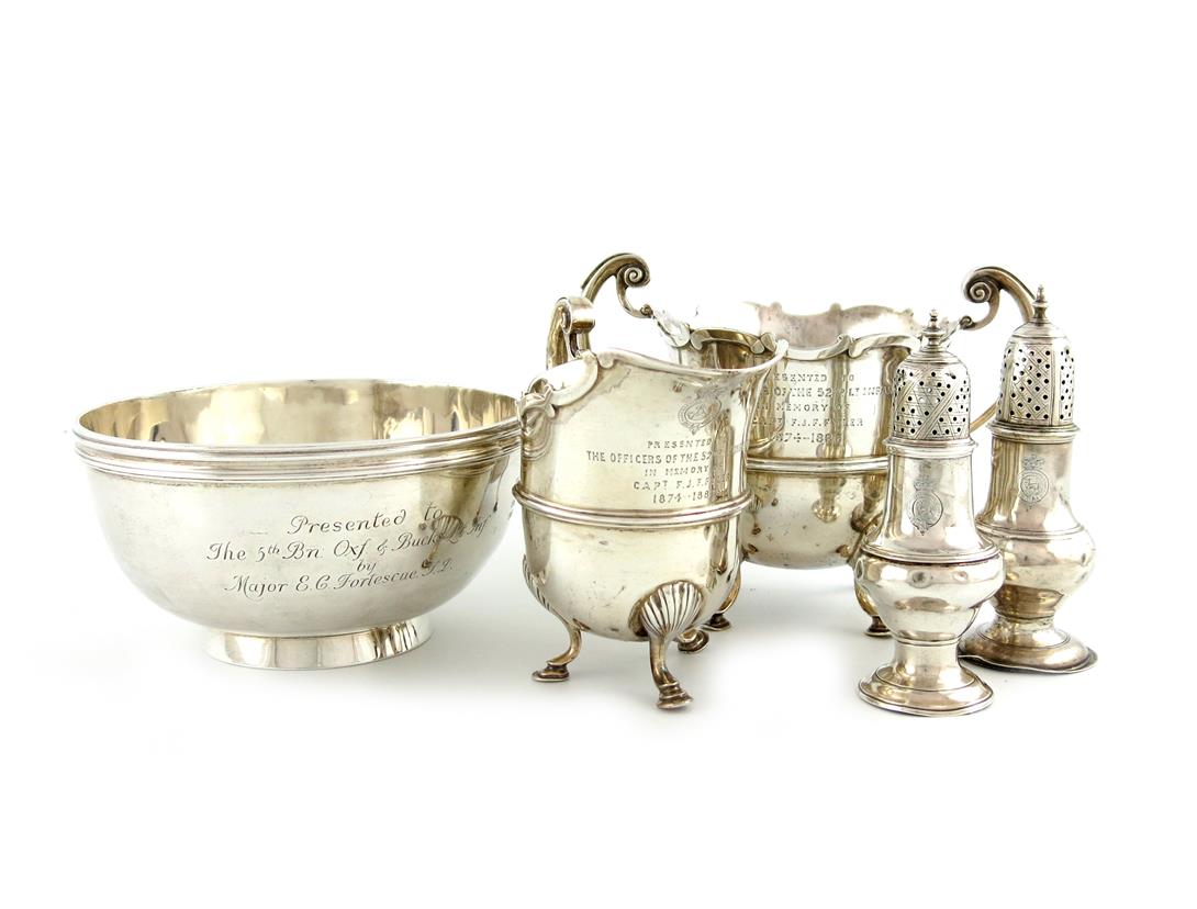comprising: a Victorian cream jug and sugar bowl, London 1887, with the regimental badge of the Oxfordshire Light Infantry and with an inscription to the officers, plus a circular bowl, 'The North Challenge Bowl, London 1905, and two George III casters, London 1774, the other date letter rubbed, later inscriptions, approx. weight 38oz. (5)