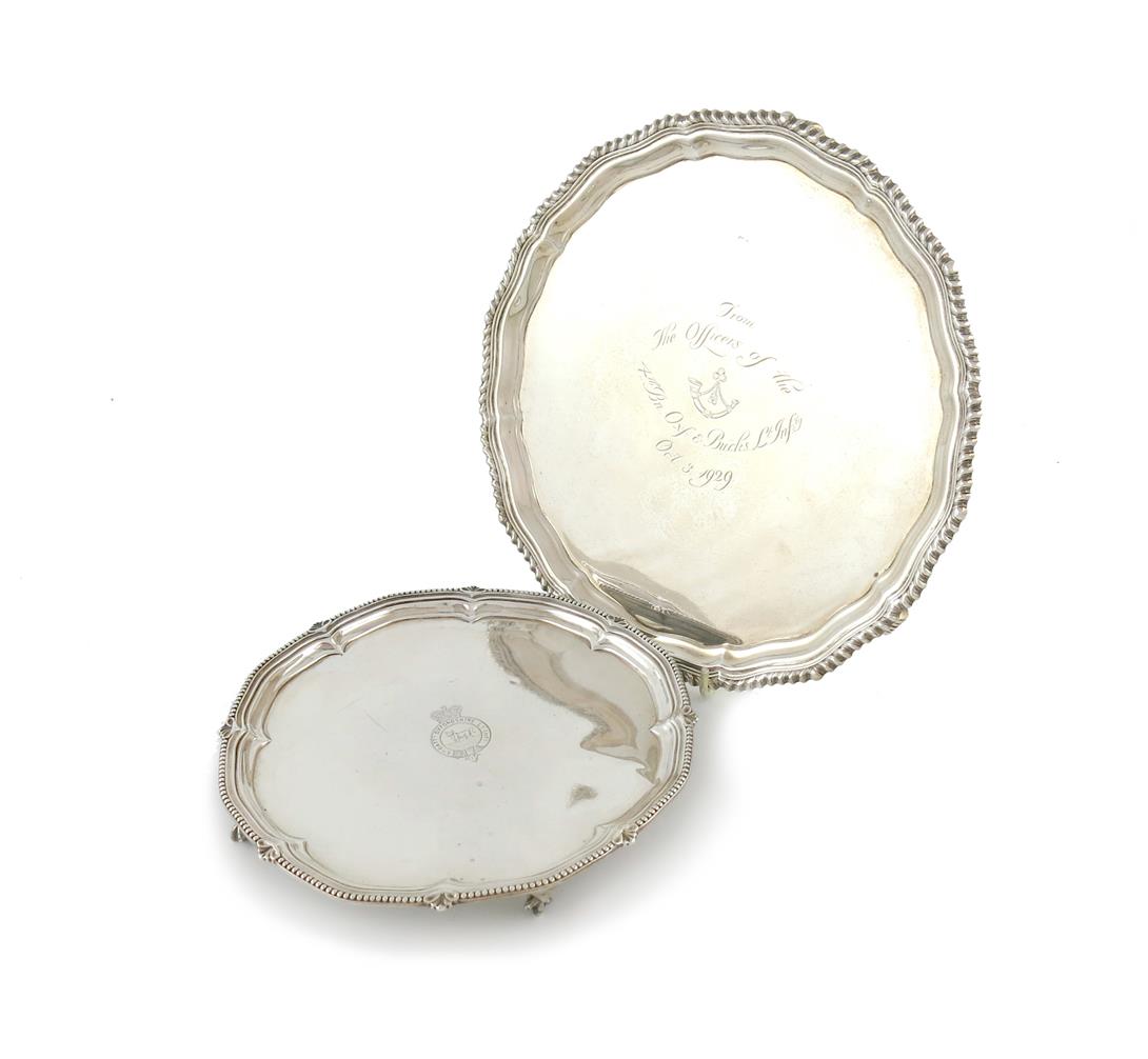 circular form, gadroon border, inscribed 'From the Officers of the 4th Bn. Oxford and Bucks Light Infantry, October 3, 1929', diameter 26.3cm, plus a presentation silver waiter, Sheffield 1894, approx. total weight 31.9oz. (2)