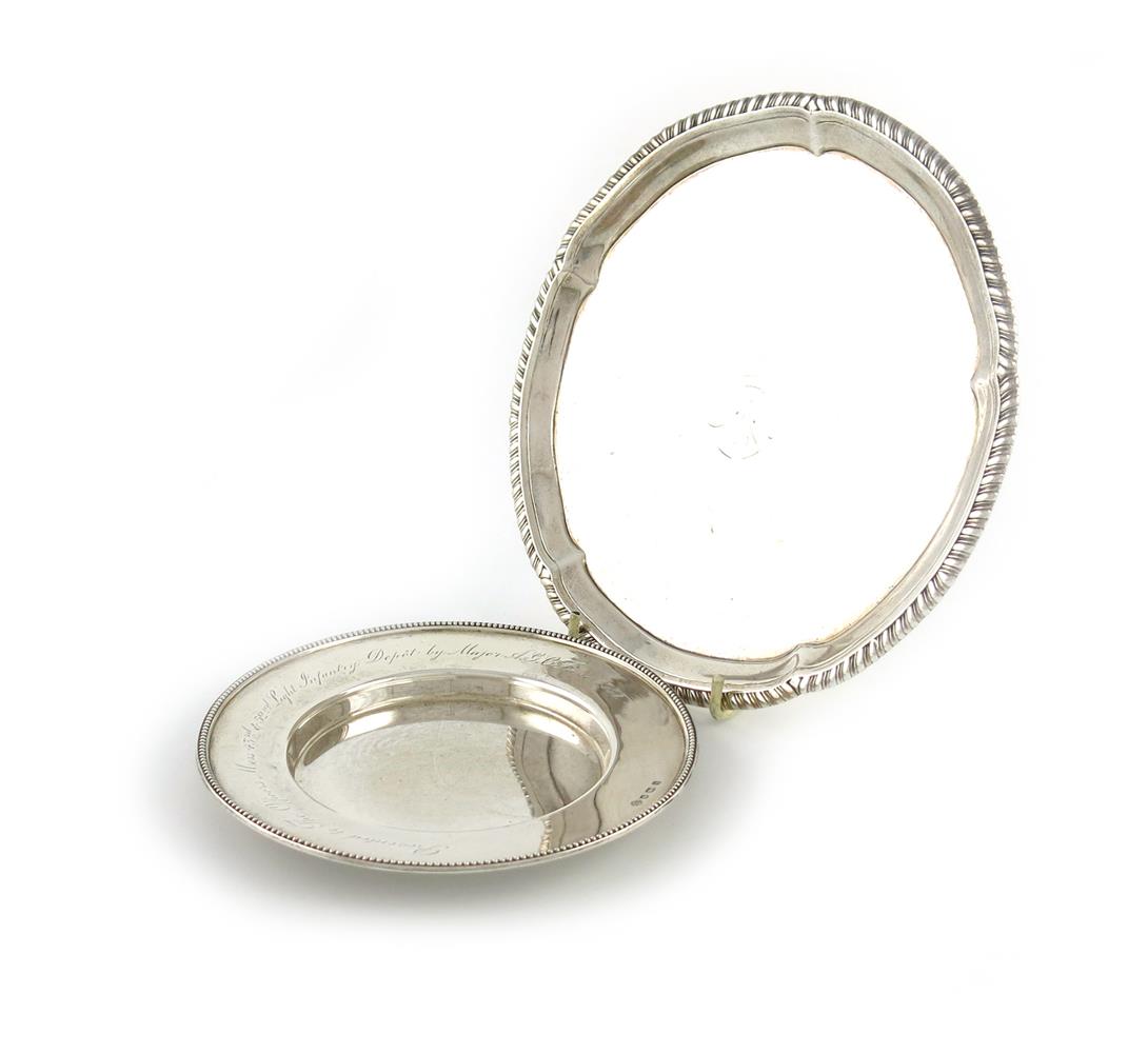 circular form, gadroon border, the centre engraved with a regimental badge, on three shell bracket feet, diameter 21cm, plus a silver dish, Sheffield 1933, approx. total weight 19oz. (2)