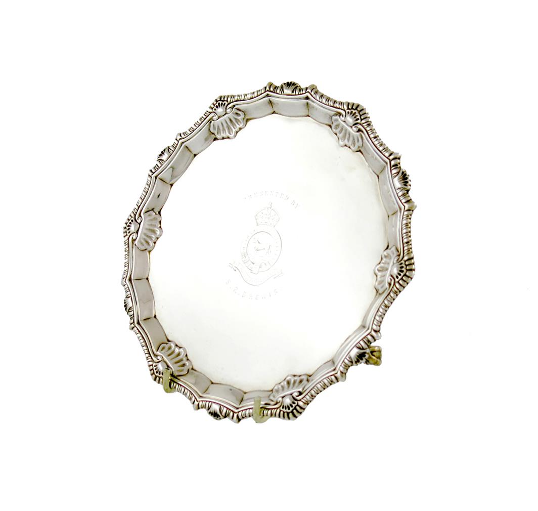 circular form, shell and gadroon border, the centre with a later regimental crest, on three claw and ball feet, diameter 20.6cm, approx. weight 12oz.