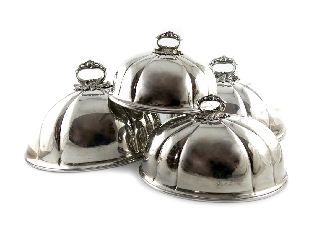 domed lobed oval form, detachable foliate scroll handles, length of largest 51cm. (4)