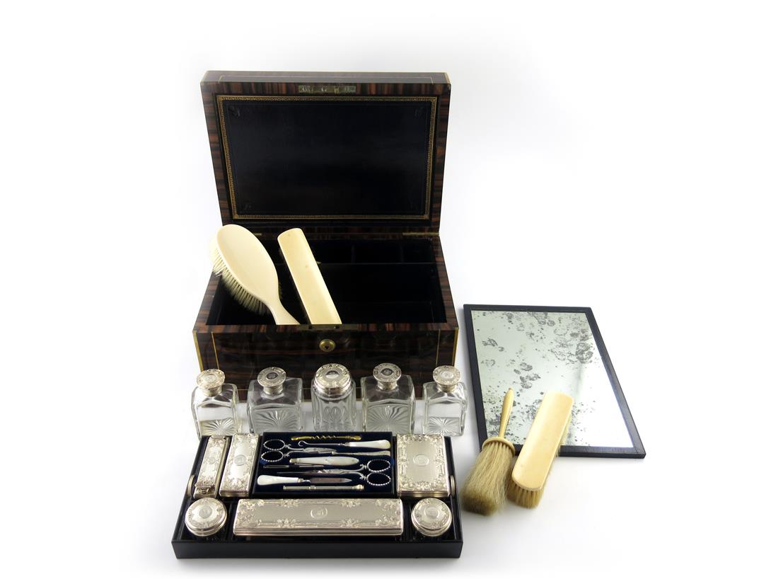 with engine-turned decoration and chased foliate decoration, initialled, plain glass bodies with star cut bases, comprising: a pair of scent bottles, a pair of toilet bottles, seven various toilet jars / boxes, plus a nine-piece manicure and writing set, with mother-of-pearl handles, in a fitted velvet tray, four ivory brushes in a fitted brass bound hardwood case, the interior of the cover fitted with a mirror, and a stationary wallet, the front with a jewellery drawer, the case with initials, with a key, length of case 33.3cm, approx. weighable 9.5oz.