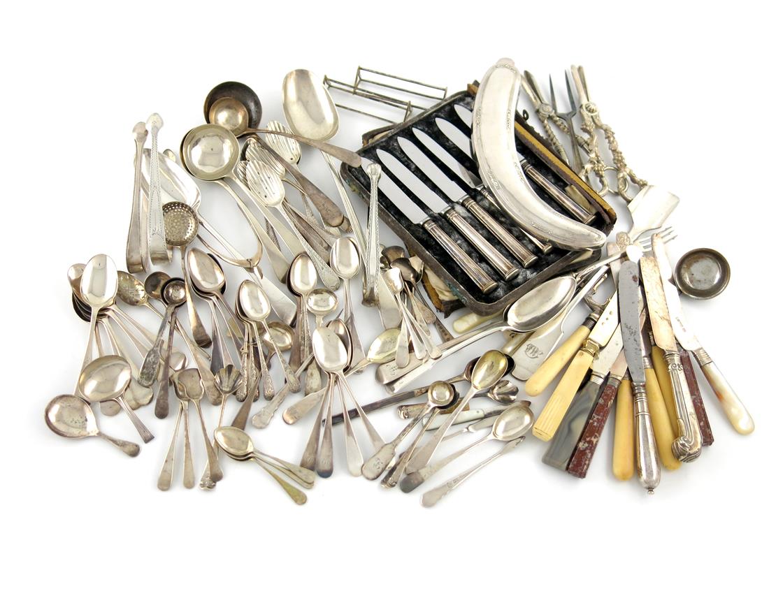 comprising silver items: a George III Bright-cut basting spoon, by Hester Bateman, London 1784, a pair of knife rests, London 1804, a mote spoon, a tablespoon, four ladles, two dessert spoons, three pairs of sugar tongs, a pair of wishbone sugar tongs, nine fruit knives with various handles including agate, thirty-two teaspoons, a sifting spoon, two caddy spoons, a marrow spoon, twenty-two condiment spoons, a fruit knife, a fork, a cased set of six butter knives, a butter knife, and a nut pick, plus electroplated items: a stilton scoop, a crumb brush mount, two pairs of grape scissors and a toddy ladle, approx. weighable 41oz. (qty)