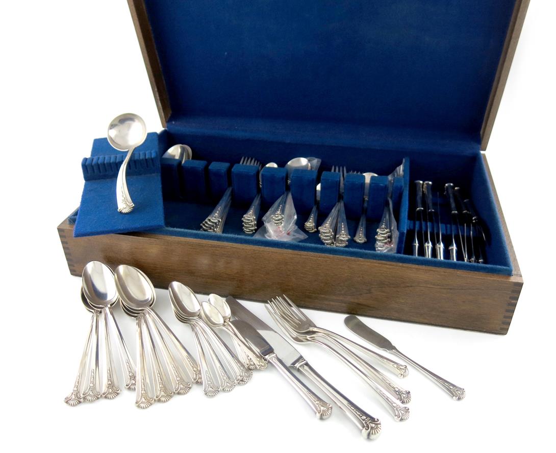 comprising: eight small table / dessert forks, eight table knives, eight dessert spoons, eight soup spoons, eight coffee spoons, eight fish forks, eleven teaspoons, eight oyster forks, three tablespoons, sauce ladle, two butter knives, six silver-handled side knives, in a fitted wooden case, approx. weighable 77oz. (qty)