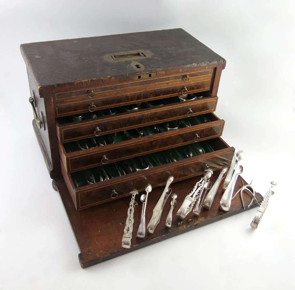 the majority antique, comprising: a pair of early 19th century Scottish provincial silver sugar tongs, by James Orr, Greenock circa 1814, plus various towns, including Glasgow, Newcastle, Edinburgh, Dublin, York, London, Birmingham, and Exeter, plus a continental pair and an electroplated pair, in a fitted four drawer lockable cabinet with a key, approx. weighable 57.5oz. (47)