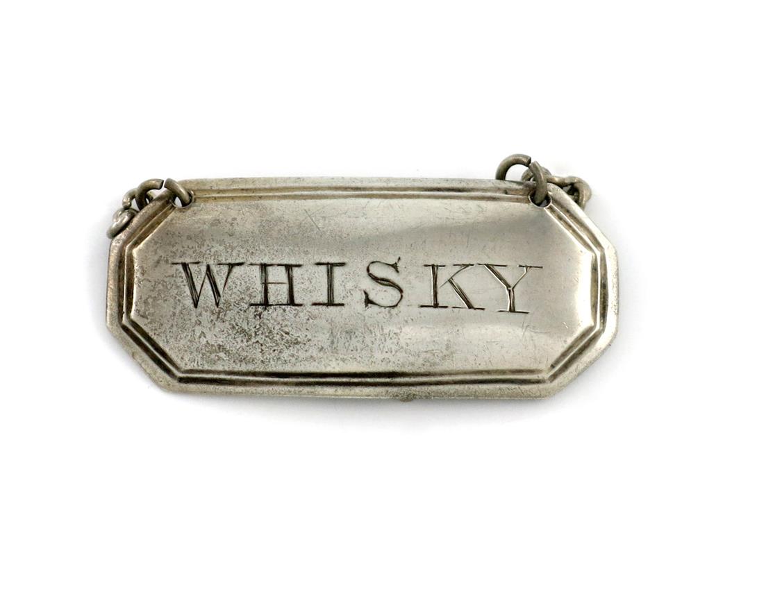 rectangular form, canted corners, reeded border, incised 'WHISKY', length 3.4cm, approx. weight 0.3oz.
