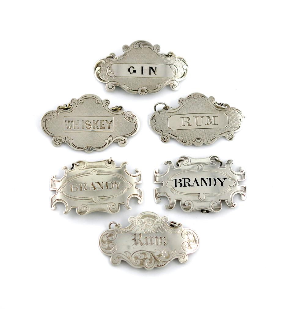 various dates and makers including Alfred Taylor, incised and blackened 'BRANDY' and 'GIN', plus various others incised 'BRANDY', 'WHISKEY' and 'RUM x2, approx. weight 2.1oz. (6)