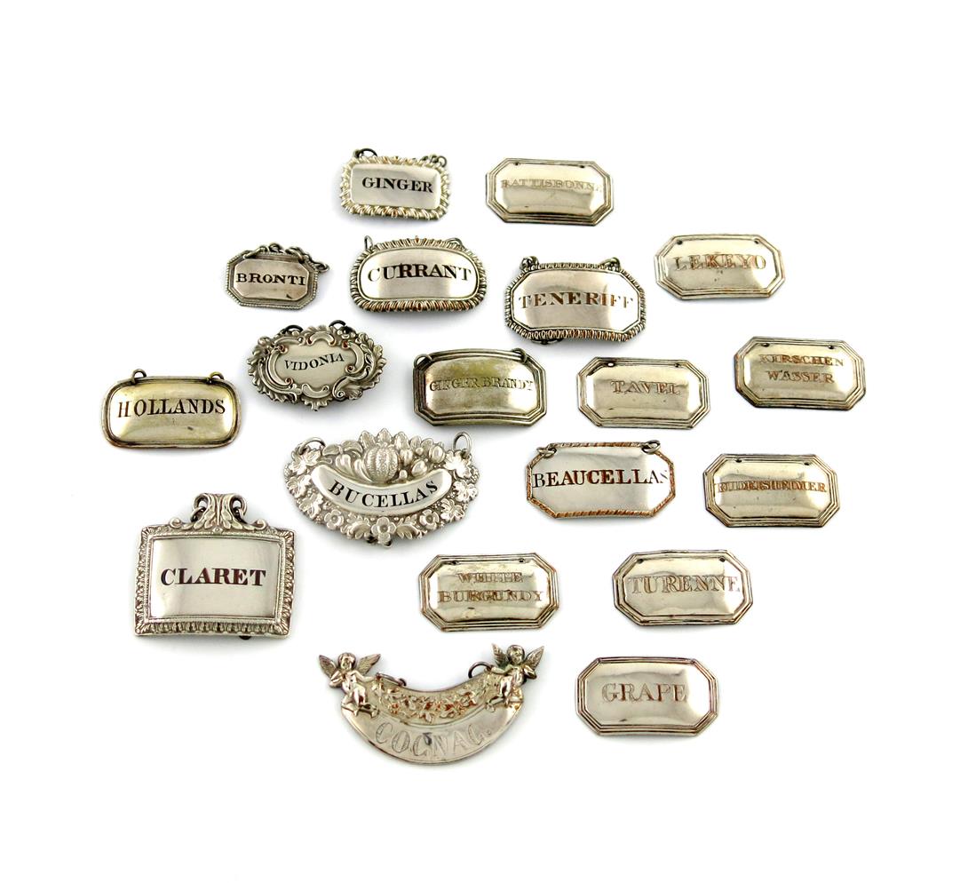 A collection of nineteen old Sheffield and electroplated wine labels,