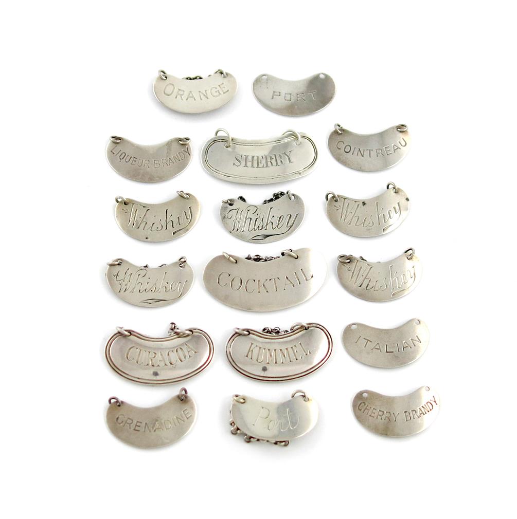 kidney form, including a set of six, London 1930, incised 'GRENADINE', 'PORT', 'COINTREAU', 'LIQUEUR BRANDY', 'CHERRY BRANDY' and 'ITALIAN', plus a set of four incised 'WHISKEY', plus 'KUMMEL', 'COCKTAIL', 'CURACOA', 'SHERRY', 'WHISKY', 'PORT' and 'ORANGE', approx. weight 2.3oz. (17)