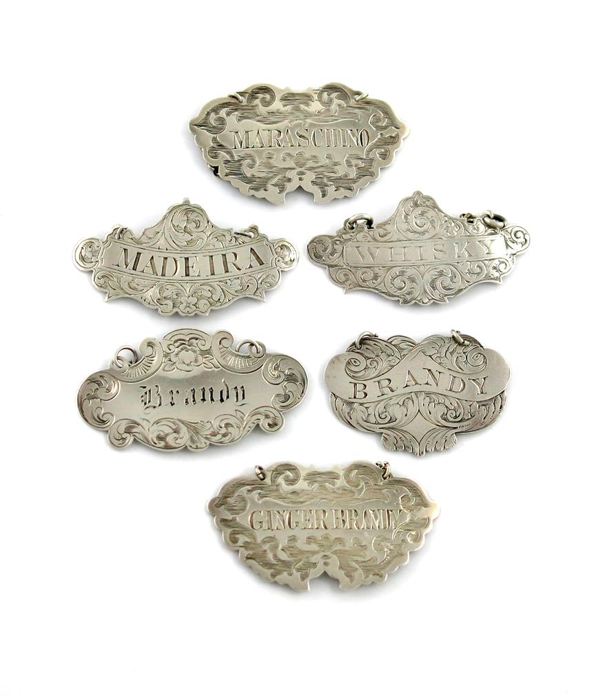 engraved cartouche form, including a pair by George Unite, Birmingham 1867, incised 'GINGER BRANDY' and 'MARASCHINO', plus various others incised 'MADEIRA', 'WHISKY' and 'BRANDY x2, approx. weight 1.5oz. (6)