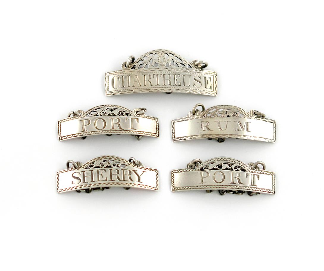 narrow rectangular form, pierced pediments, comprising: one by Phipps and Robinson, London 1794, incised 'SHERRY', plus one incised 'CHARTREUSE', unmarked, one 'RUM', and two 'PORT', approx. weight 1.2oz. (5)