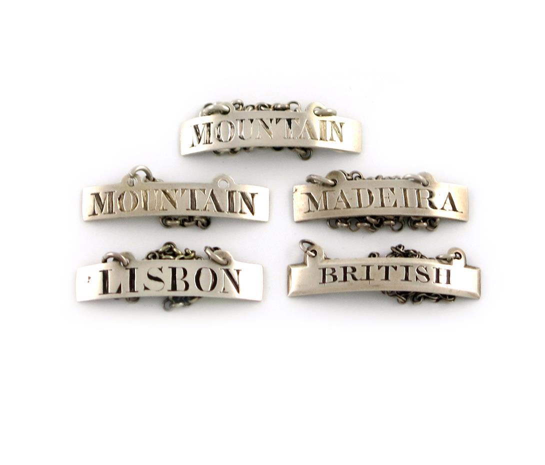 narrow rectangular form, comprising: one by Thomas Wallis, London circa 1790, incised and blackened 'BRITISH', plus one 'LISBON', one 'MADEIRA' and two 'MOUNTAIN', approx. weight 0.8oz. (5)