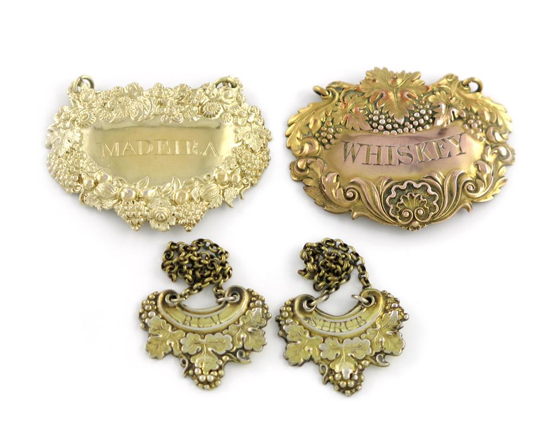 shaped oval form, vine and shell decoration, incised 'WHISKEY', plus a silver-gilt label incised 'MADEIRA', and a pair of unmarked labels of scroll and vine leaf form, incised 'RUM' and 'SHRUB', approx. weight 2.5oz. (4)