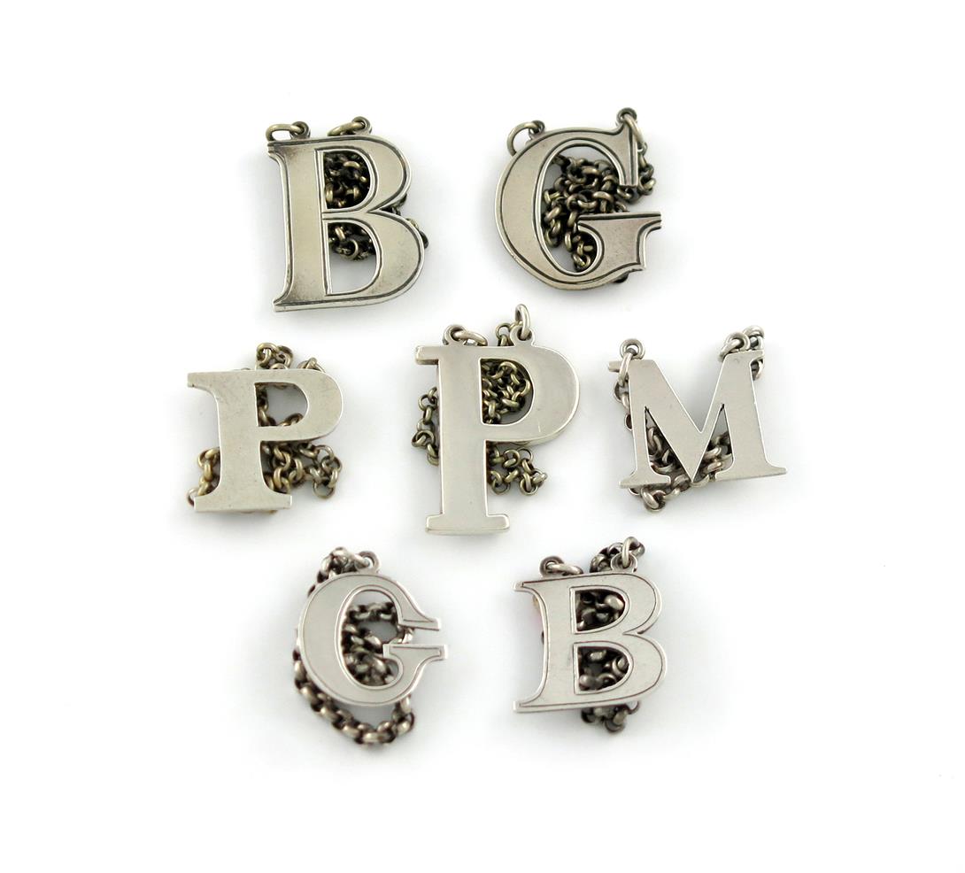 plain form and some with a thread border, including one by George Unite, Birmingham 1863, modelled as a 'P', plus various others, two unmarked, titled 'B' (x2) 'G' (x2), 'M', and 'P', approx. weight 2.6oz. (7)