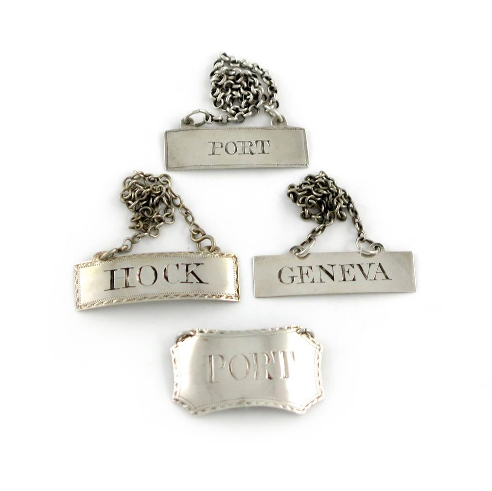 comprising: one by Andrew Goodwin, Dublin circa 1780, bright-cut border, incised 'PORT', another by John Townsend, Dublin circa 1800, incised and blackened 'HOCK', plus one retailed by M. West incised 'GENEVA' and one possibly by Matthew Bellow of Belfast, incised 'PORT', approx. weight 0.9oz. (4)