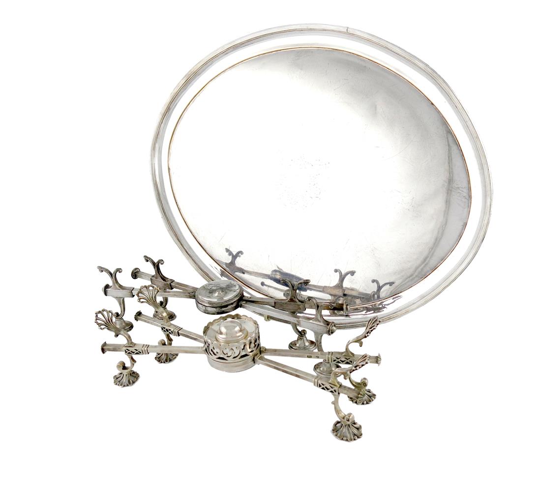 comprising: a George III silver dish cross, by Samuel Herbert & Co, London circa 1760, conventional form, lacking original burner, plus Old Sheffield plated items: an oval salver, a dish cross, a pair of wine coasters, and electroplated items: a muffin dish and cover, a chamber stick, a coaster, a kettle stand and burner, a lighter and a mug, approx. weighable 14oz. (qty)
