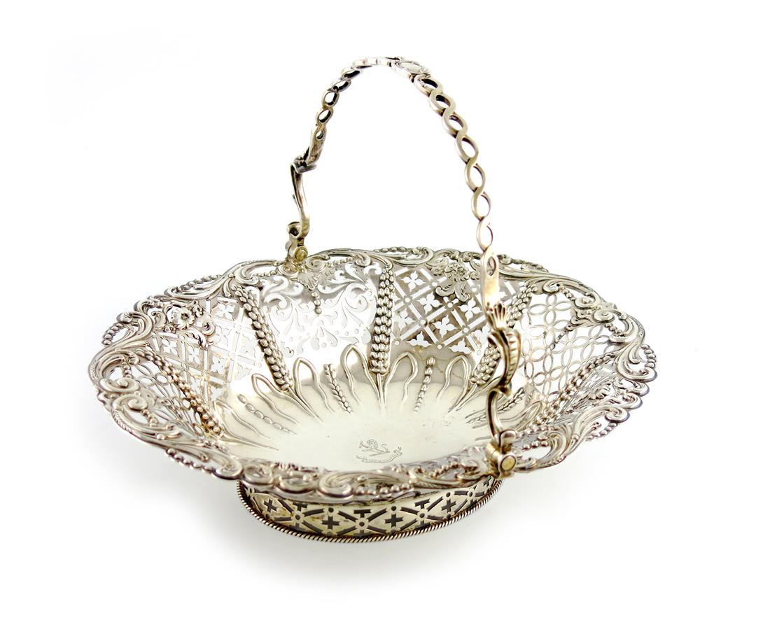 oval form, pierced with mullets and scroll decoration, and embossed with ears of wheat, pierced swing-handle, on a pierced oval foot, with a rope-work border, the centre with a crest and motto, length 33.3cm, approx. weight 23.7oz.