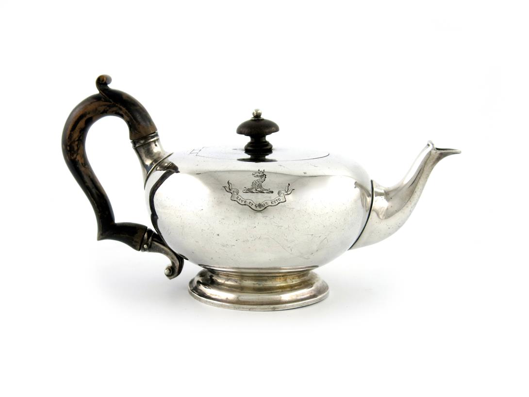 plain bullet form, flush hinged cover with a knop finial, scroll handle, on a raised circular foot, length handle to spout 23.2cm, engraved with a crest and motto, approx. weight 18.4oz.