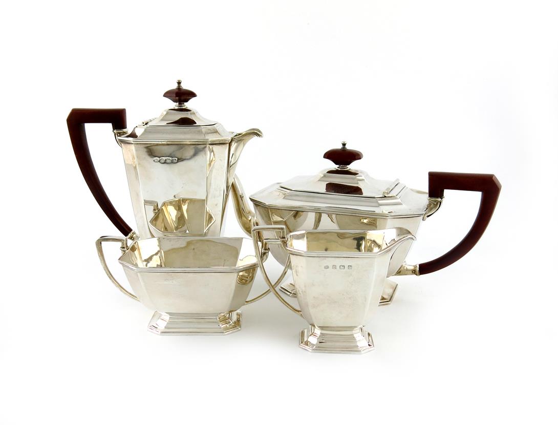 tapering panelled rectangular form, scroll handles, on a raised rectangular foot with canted corners, length of teapot handle to spout 28.8cm, approx. weight 56oz. (4)