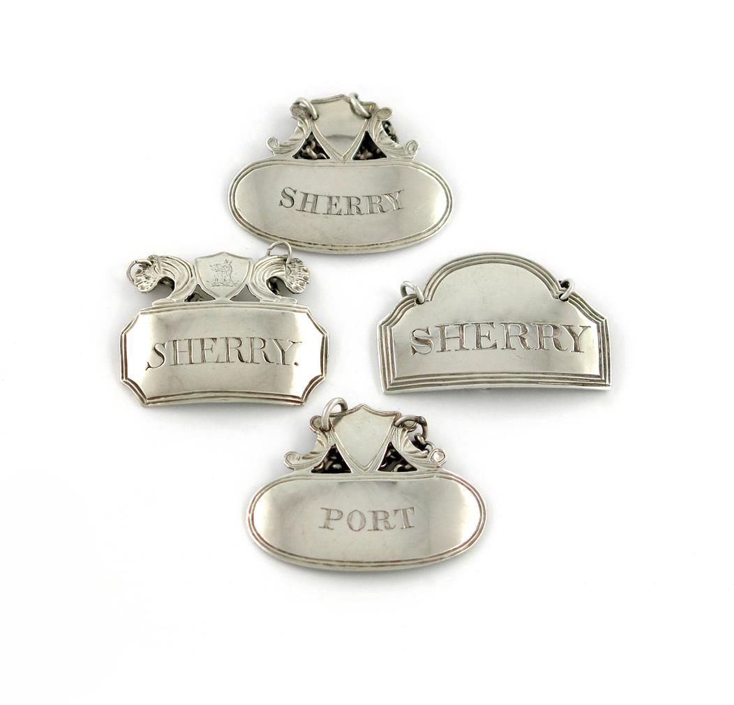 comprising: a Victorian pair by Reid and Sons, Newcastle circa 1845, oval form, with a raised shield cartouche and reeded borders, incised 'SHERRY' and 'PORT', plus one by Langlands and Robertson, rectangular form, canted corners, reeded borders, with a shield cartouche, engraved with a crest, incised 'SHERRY' and another label, by William Lister, incised 'SHERRY', approx. total weight 1.5oz. (4)