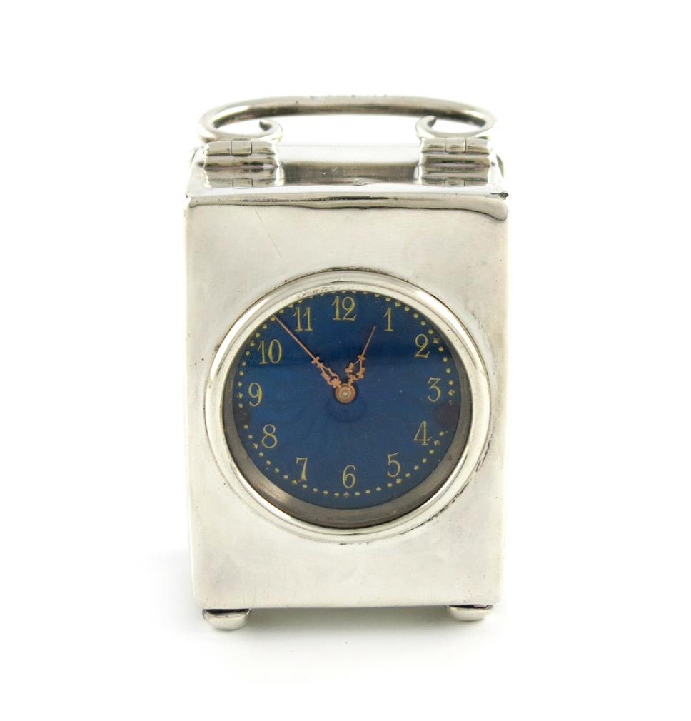 rectangular form, hinged carrying handle, with a blue enamelled dial, on four bun feet, height 6.8cm.