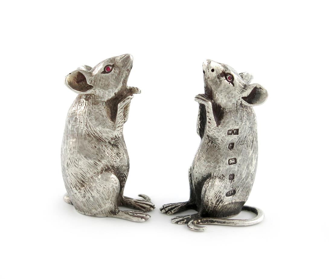 modelled as mice seated on their haunches, with red glass eyes, height 5.8cm, approx. weight 3oz. (2)