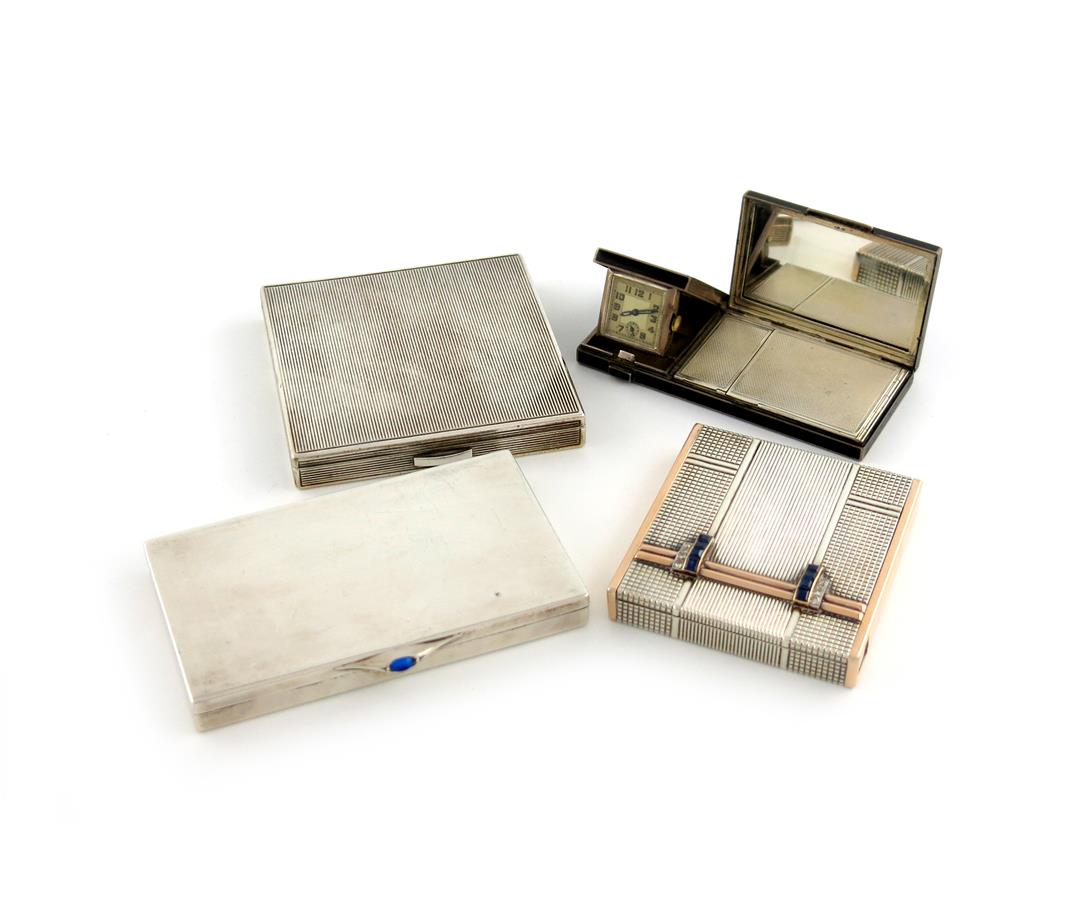 comprising: a French gem set compact, maker's mark Z.L in a lozenge, fluted decoration, the sides applied with gold bands, the cover set with sapphires and diamonds, plus a French silver compact retailed by Dunhill, Pairs, square form, reeded decoration, plus a silver and enamel watch / compact, with import marks for London 1928, importer's mark of H. C. Freeman Limited, rectangular form, black enamel decoration, gilded interior, plus a Danish silver cigarette case, by Anton Michelsen, 1935, rectangular form, blue thumb-piece, approx. weight 15oz. (4)