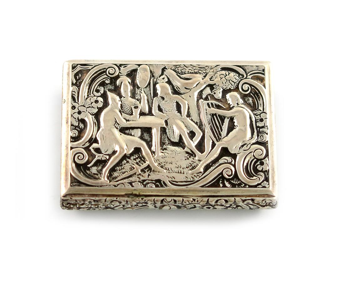 rectangular form, the hinged cover with a scene of seated warriors drinking around a table listening to music, foliate scroll sides, engine-turned base with a vacant cartouche, foliate scroll thumb-piece, gilded interior, length 7.8cm, approx. weight 4.1oz.