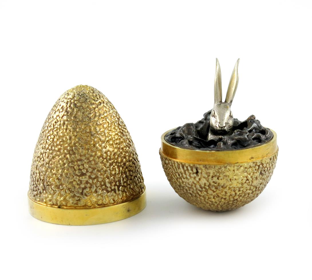 the egg with textured decoration, the cover opens to reveal a silver rabbit's head, in a fitted case, retailed by Collingwood of Conduit Street, height 7.5cm.