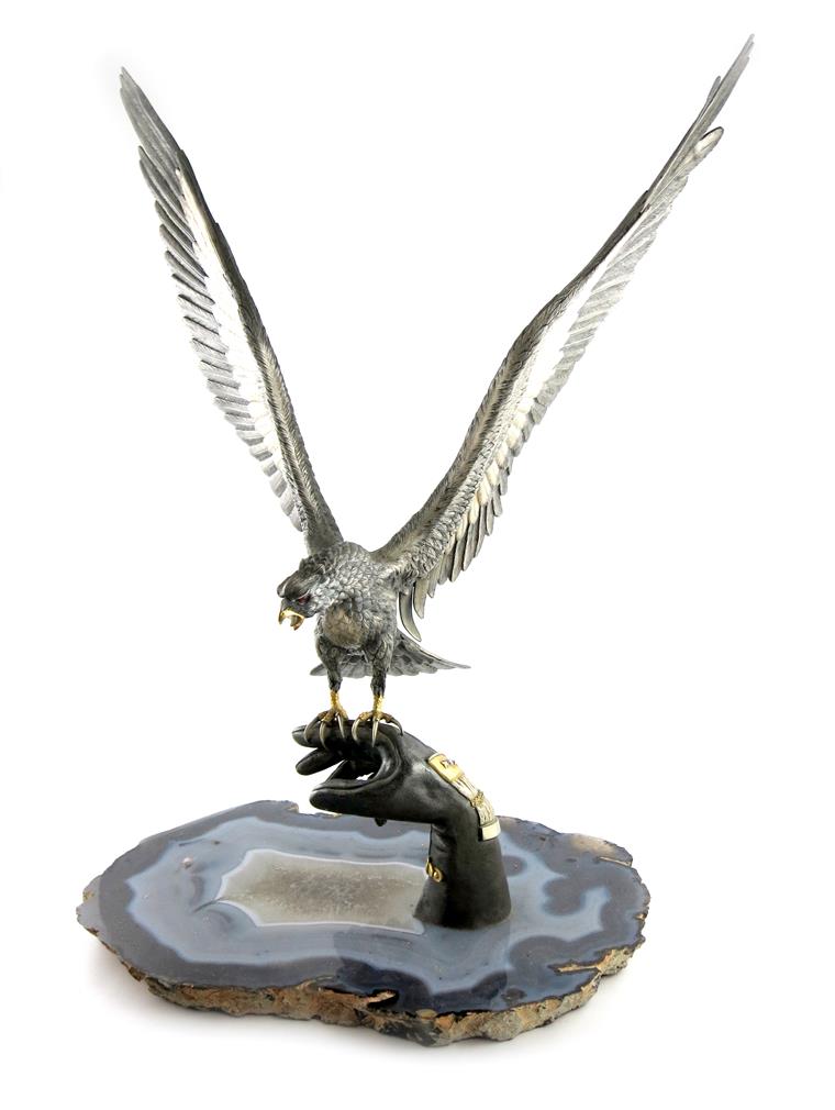 with out-stretched wings, gilded beak and talons, and set with red eyes, perched on a gloved hand with gilt highlights, on a large agate base, total height 67.5cm, length of base 45cm.