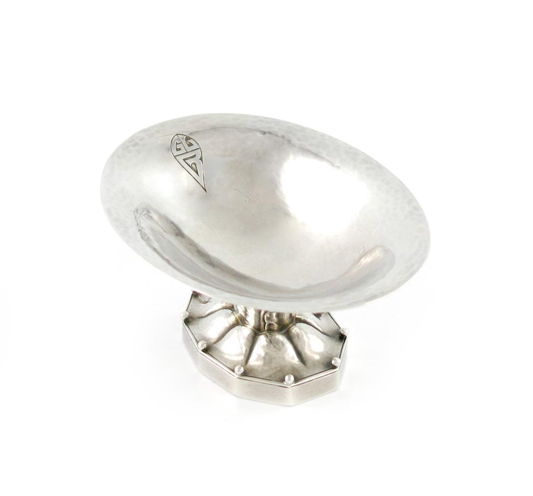 oval bowl, spot hammered decoration, on an acanthus stem, on a raised panelled oval foot with ball decoration, length 9.8cm, approx. weight 1.9oz.