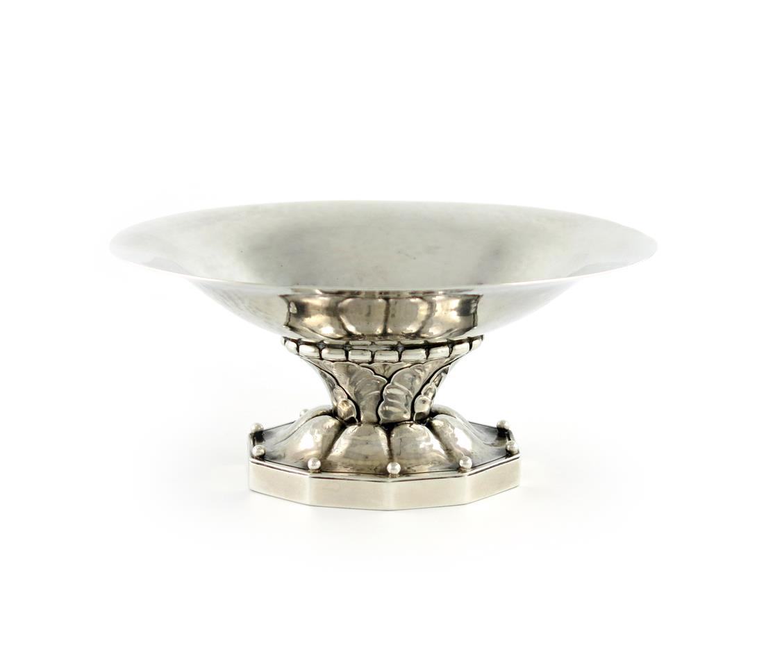 oval bowl, spot hammered decoration, on an acanthus stem, on a raised panelled oval foot with ball decoration, length 12.3cm, approx. weight 3.49oz.