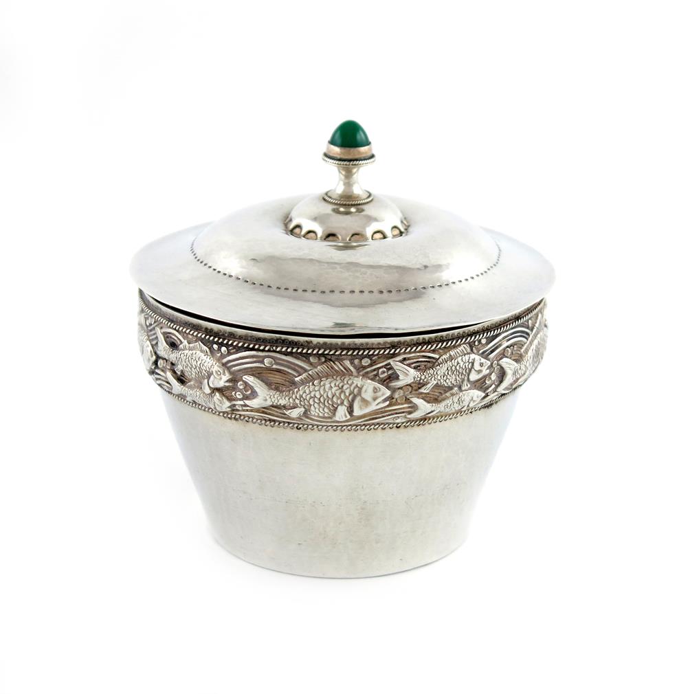 tapering circular form, spot-hammered decoration, with an applied chased band of swimming fish, the pull-off cover with a Chrysoprase finial and punch borders, diameter 11.3cm, approx. weight 12oz.