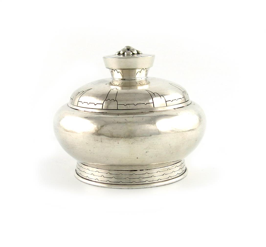 circular bellied form, spot-hammered decoration, the pull-off cover with engraved decoration and with a tapering finial with cone decoration, diameter 11.8cm, approx. weight 10.6oz.