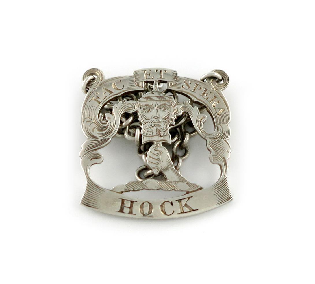 banner form, pierced and engraved with a hand holding a head on a spike with the motto 'FAC ET SPERA' incised 'HOCK', length 3.2cm, approx. weight 0.3oz.