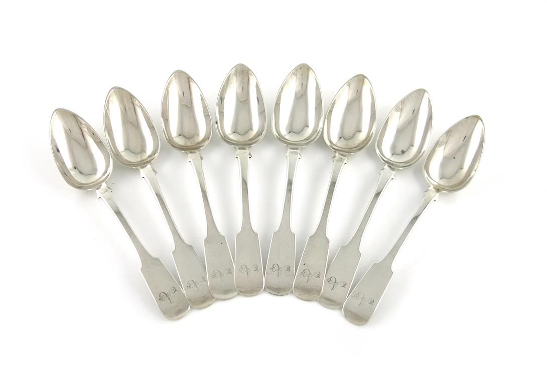 A set of eight 19th century Scottish provincial silver Fiddle pattern dessert spoons,