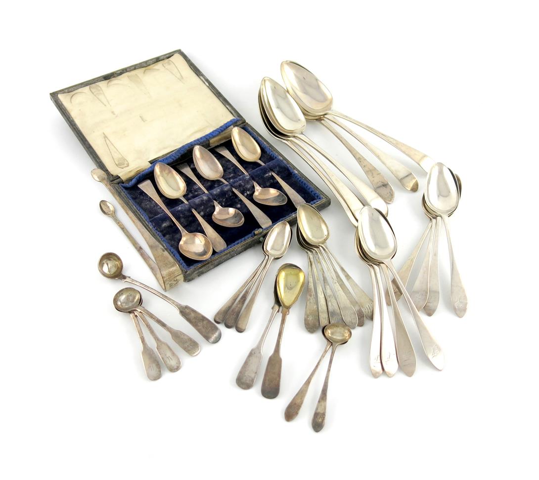 comprising: a set of six George III Celtic Point pattern tablespoons, by Alexander Henderson, Edinburgh 1798, plus a set of eight dessert spoons, Edinburgh 1795, a pair of sugar tongs, by J. Douglas, Dundee circa 1800, two sets of six teaspoons, three further teaspoons, and eight condiment spoons, approx. weight 31oz. (qty)