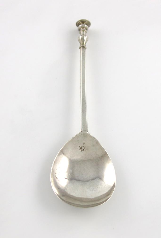 fig shaped bowl, faceted tapering stem, the finial with traces of gilding and scratch initialled 'D.S' over I*E', '1627', length 19cm, approx. weight 1.5oz.