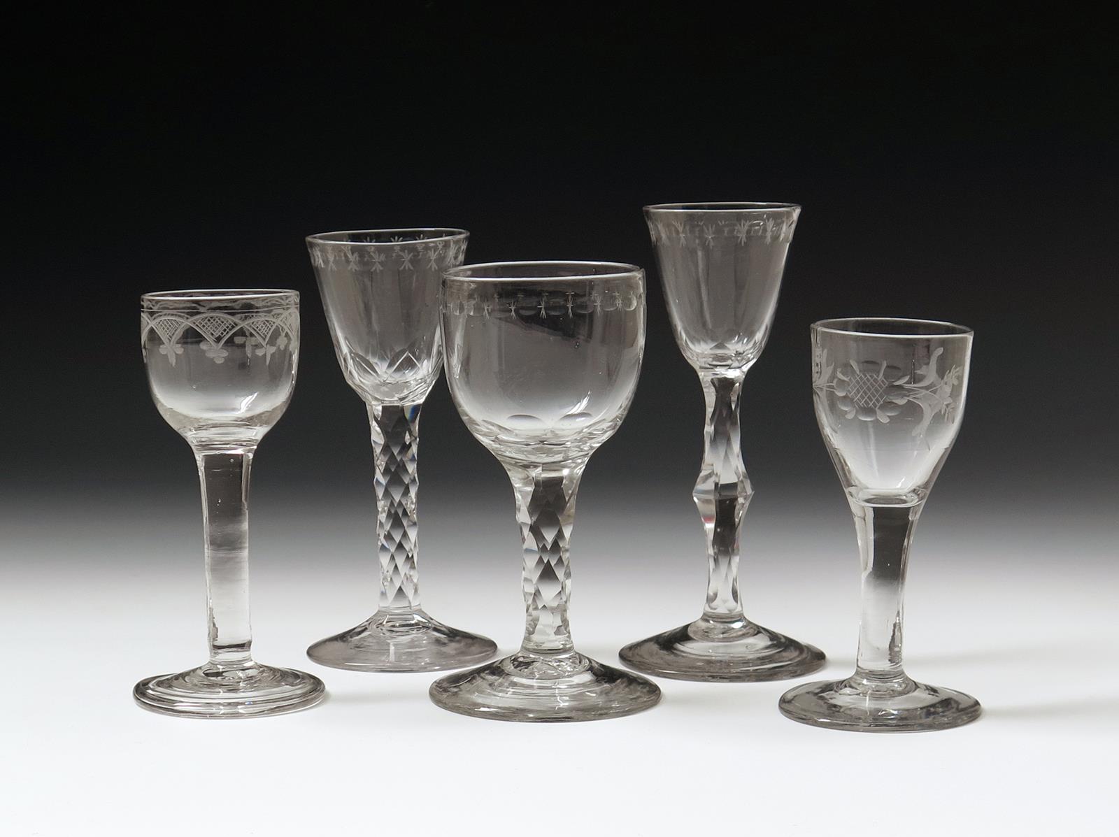 Five wine glasses c.1770-80, three cut with a band of polished ovals and raised on faceted stems, one engraved with a bird and a flower spray, one with a formal swag border, both on plain stems, 15.7cm max. (5)