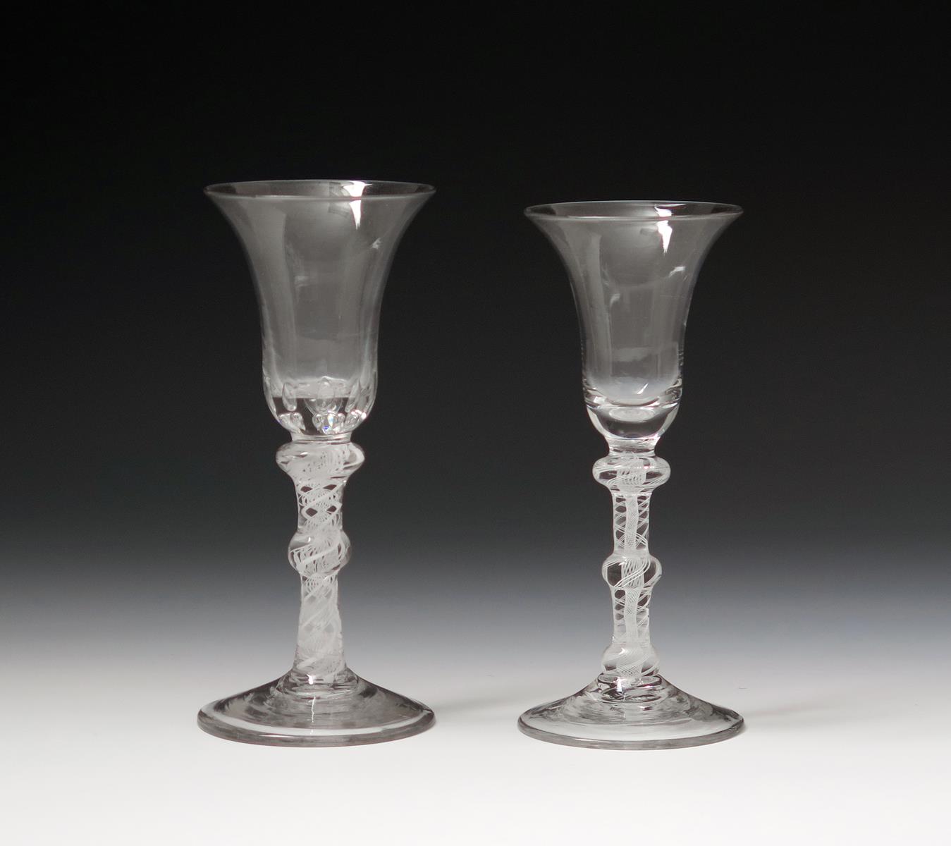 Two wine glasses c.1760-70, with bell bowls, one enclosing a row of tears above a double knopped opaque twist stem, the other with a triple-knopped double series opaque twist stem, 17cm max. (2)
